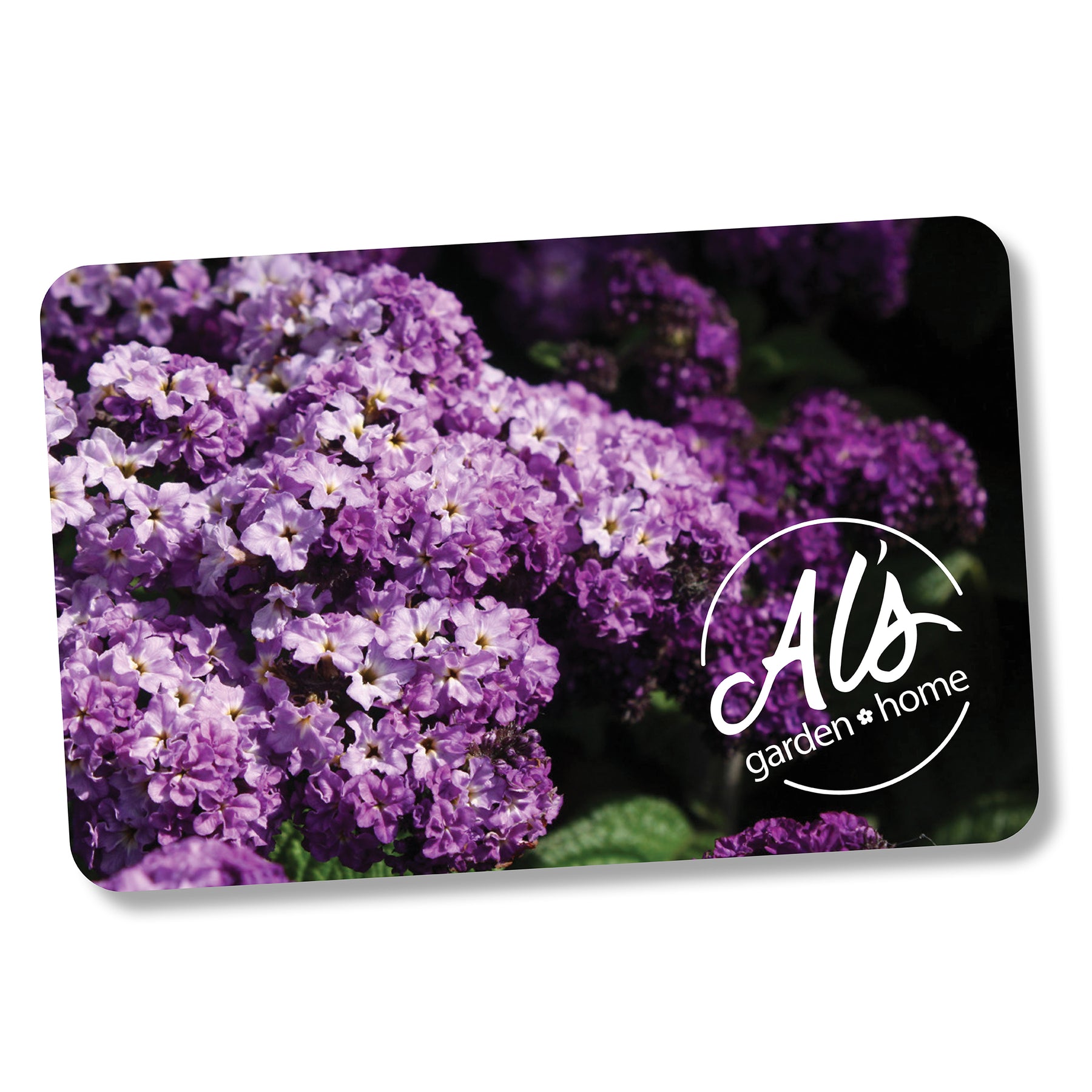 Al's Garden and Home Gift Card with a heliotrope background